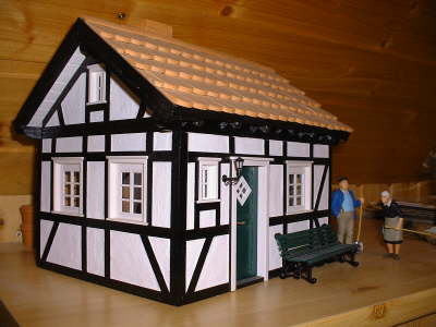 Die Fenster und die Rahmen wurden aus weisen Kunststoff-Profilleisten geschnitten und Stück für Stück in die Holzrahmen eingesetzt.