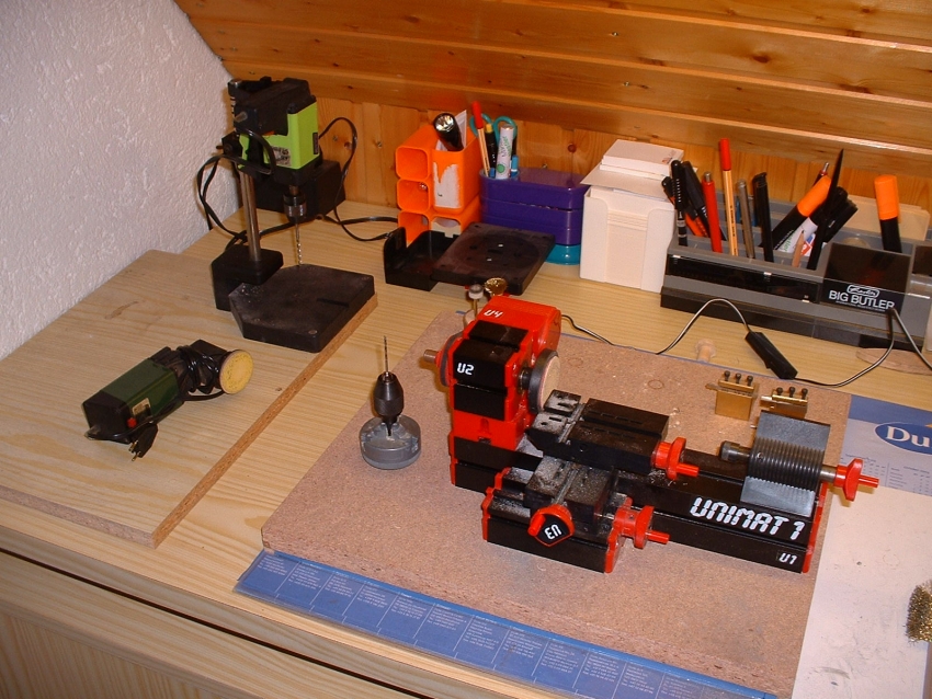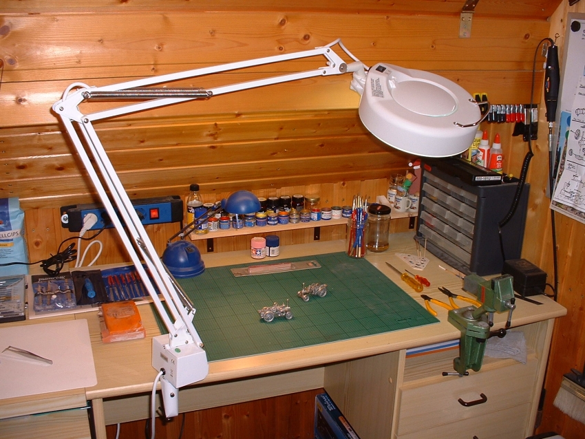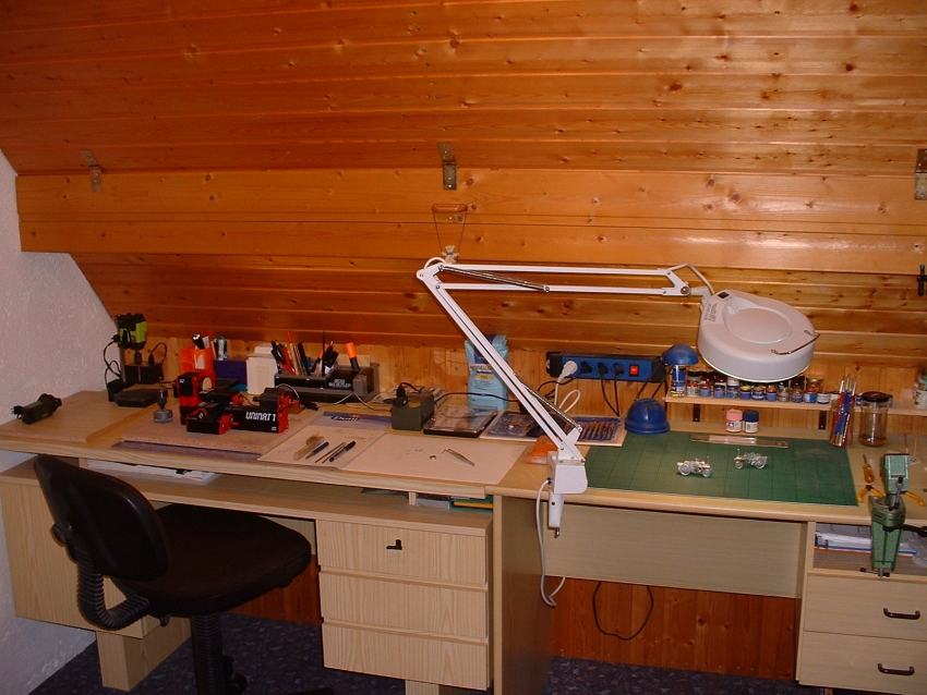Das Schöne an diesem Hobby ist, das für diese Arbeiten nur sehr wenig Platz benötigt wird. Mein Arbeitsbereich für die Modelle im Maßstab 1:76 und 1:87 beschränkt sich fast ausschließlich auf zwei Schreibtische in einem Zimmer auf dem Dachboden.